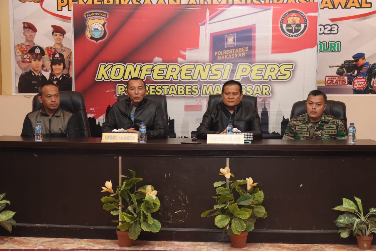 Kapolda Sulsel Irjen Setyo Boedi Moempoeni Harso,S.H., M.Hum dan Pangdam XIV Hasanuddin Mayjen TNI Dr. Totok Imam Santoso,  menggelar Konferensi Pers terkait