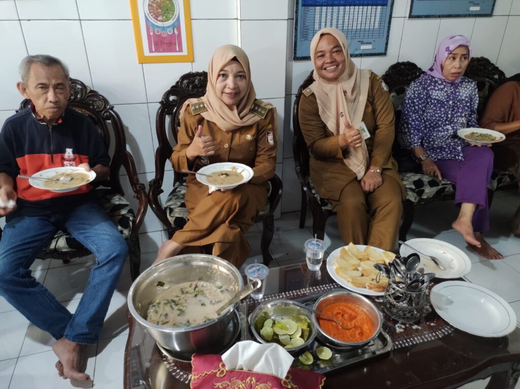 Ket. Gambar : Usai acara rapat koordinasi dilanjutkan dengan acara makan kapurung (kuliner khas Palopo) Camat Wajo, Hj. Hamna Faisal bersama Lurah Mampu, pengurus LPM, Pj RT-RW dan warga
