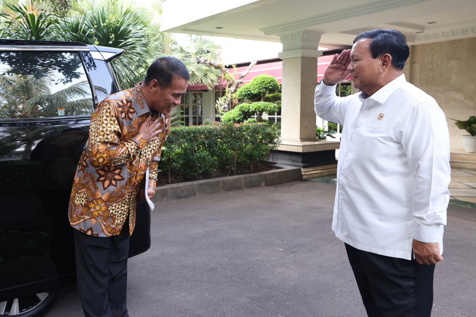 Nampak Prabowo tiba sekitar pukul 18.40 WIB. Prabowo tampak mengenakan kemeja batik berwarna coklat.