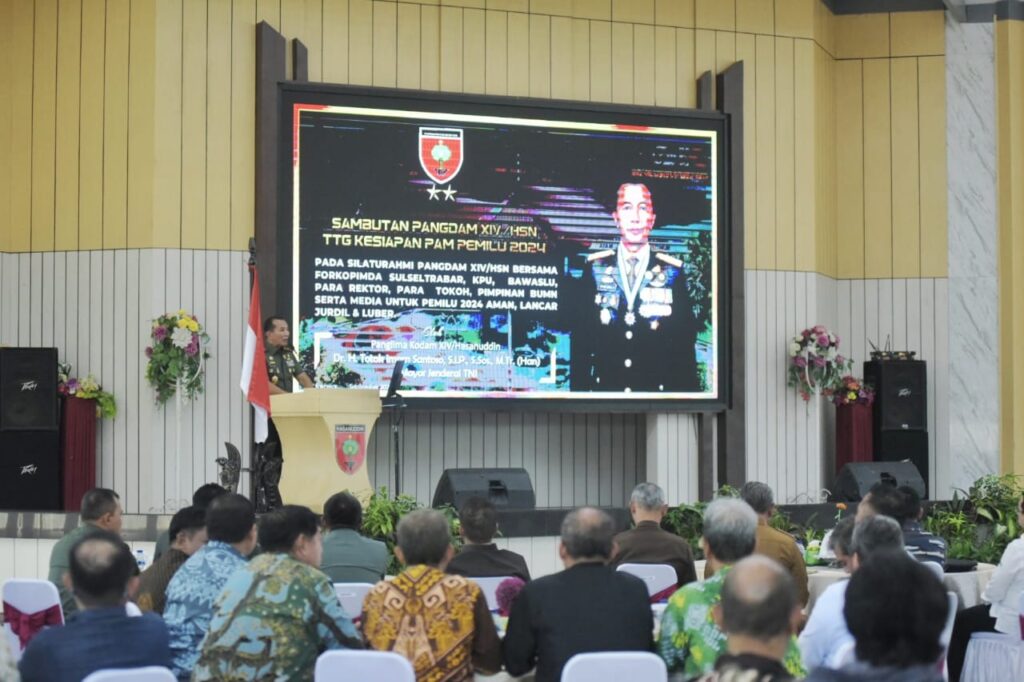 SIMAKBERITA.COM, MAKASSAR – Wujudkan Pemilu 2024 yang luber, jurdil, aman dan damai, Pangdam XIV/Hasanuddin Mayjen TNI Dr. Totok Imam Santoso, S.I.P., S.Sos., M.Tr (Han)., berinisiatif menggelar apel bersama Forkopimda, Komisi Pemilihan Umum (KPU) dan Badan Pengawas Pemilihan Umum (Bawaslu) Prov Sulselbartra, Para Rektor, Tokoh Agama (Toga), Tokoh Masyarakat (Tomas), Badan Eksekutif Mahasiswa (BEM), Organisasi Masyarakat (Ormas), Pimpinan Badan Usaha Milik Negara (BUMN) dan Perbankan serta Awak Media, bertempat di Balai Prajurit Hasanuddin (BPH) Kota Makassar, Kamis (21/09/2023).