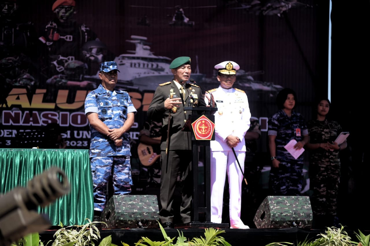 SIMAKBERITA.COM, MAKASSAR – Meriahkan Hari Ulang Tahun (HUT) ke-78 TNI Tahun 2023, Pangdam XIV/Hasanuddin Mayjen TNI Dr. Totok Imam Santoso, S.I.P., S.Sos., M.Tr (Han)., bersama Danlantamal VI Makassar Laksma TNI Ivan Gatot Prijanto, S.E., M.Tr. Opsla., dan Ir Koopsud II Marsma TNI Zulfahmi, S.Sos., M.Han., didampingi unsur Forkopimda Sulsel, ditandai penekanan tombol secara resmi membuka Pameran Alat utama sistem pertahanan (Alutsista) dengan tema “TNI Patriot NKRI Pengawal Demokrasi Untuk Indonesia Maju”, bertempat di Anjungan Pantai Losari Makassar, Minggu (01/10/2023).