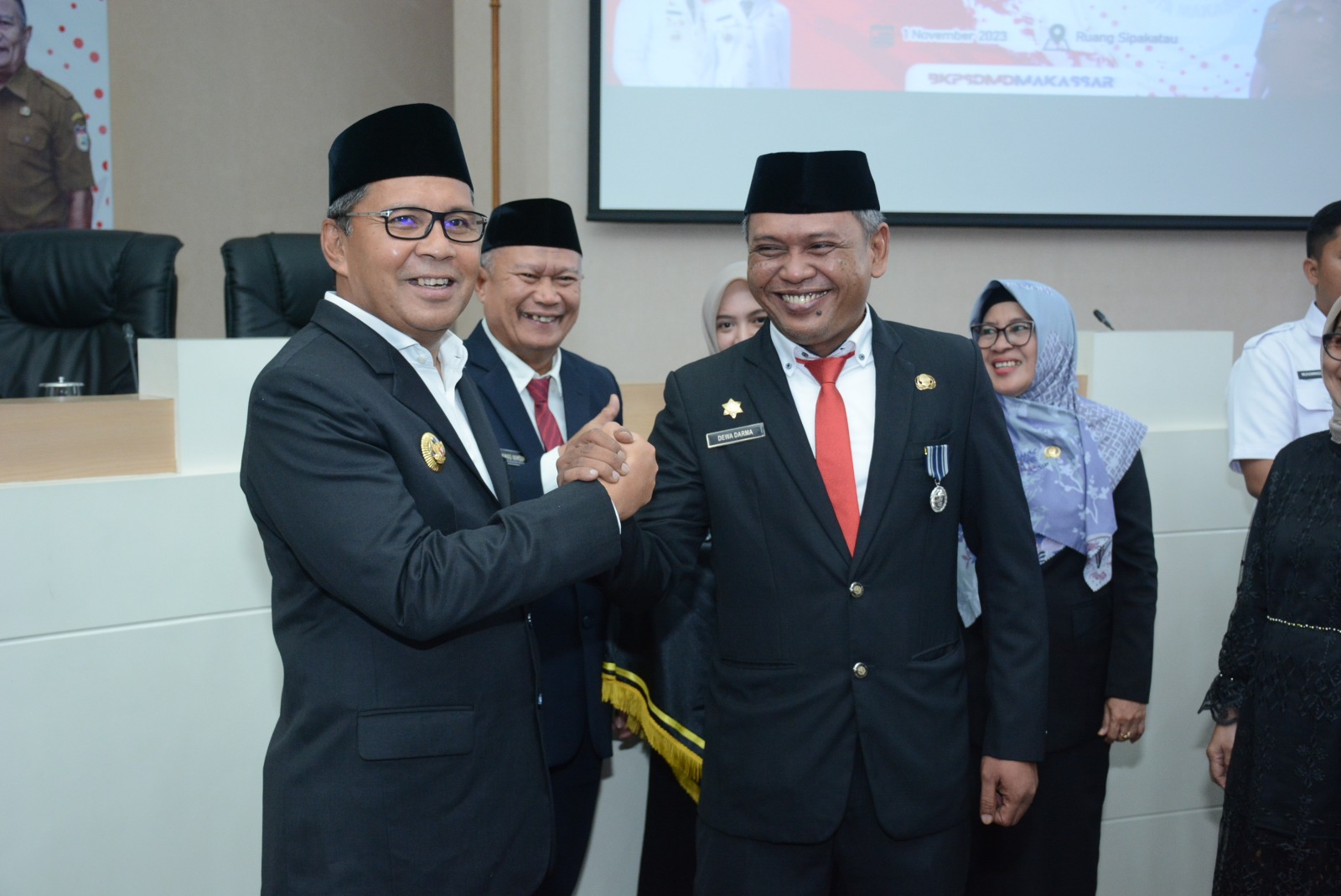 SIMAKBERITA.COM, MAKASSAR – Walikota Makassar Danny Pomanto didampingi Kepala BKPSDM Kota Makassar, Akhmad Namsum, menyerahkan tanda kehormatan Satyalancana Karya Satya dari Presiden RI A kepada 196 ASN lingkup Pemerintah Kota Makassar, di ruang Sipakatau Balai Kota Makassar, Rabu (01/11/2023).