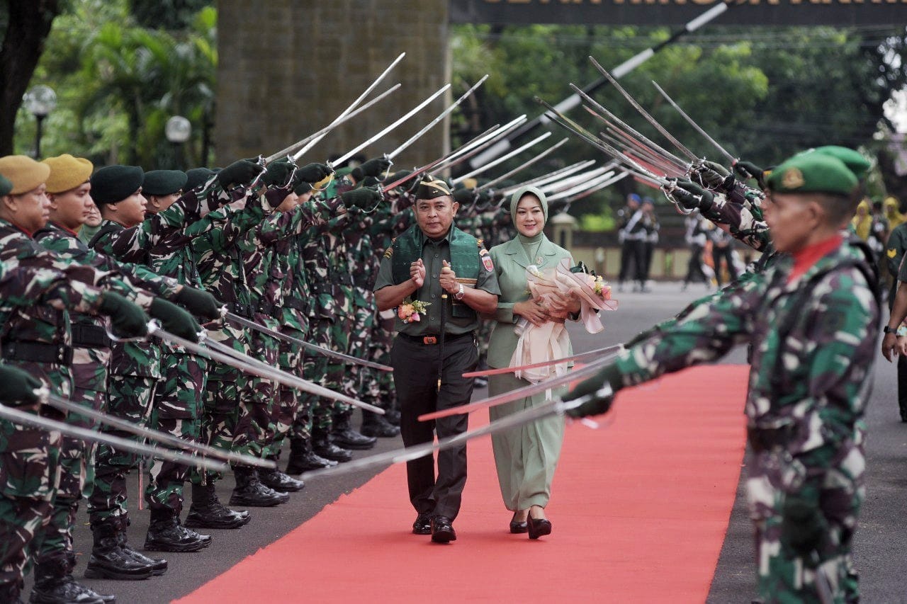 SIMAKBERITA.COM, MAKASSAR – Pangdam XIV/Hasanuddin Mayjen TNI Bobby Rinal Makmun, S.I.P., beserta Ketua Persit KCK PD XIV/Hasanuddin Ny. Mia Bobby Rinal Makmun, tiba di Markas Kodam XIV/Hasanuddin disambut dengan tradisi Pedang Pora dan penyambutan adat Bugis-Makassar, Angngaru dan Tarian Paduppa, Selasa (02/01/2024).