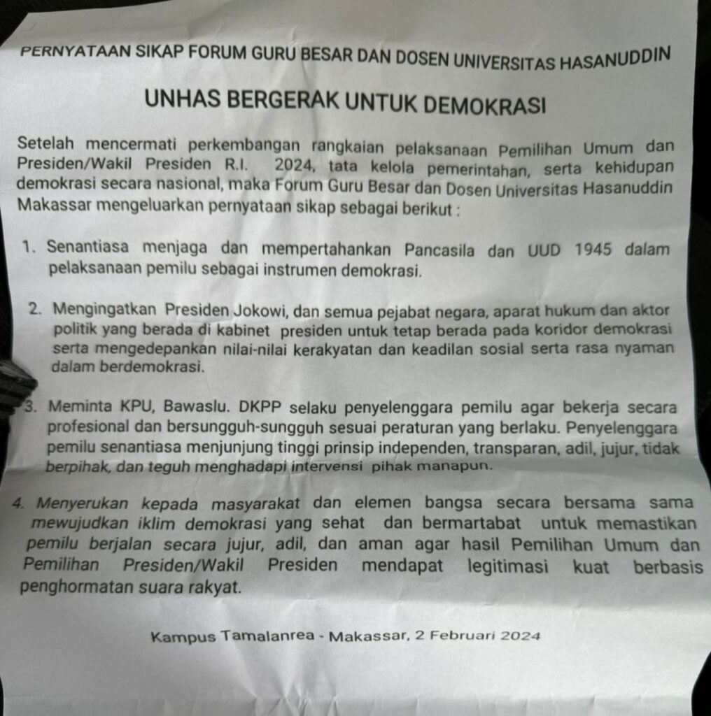 Pernyataan sikap tersebut dibacakan oleh Prof. Dr. Ir. Triyatni Martosenjoyo berikut isi pernyataan sikap Forum Guru Besar dan Dosen Unhas. Unhas Bergerak Untuk Demokrasi. Setelah mencermati rangkaian pelaksanaan pemilihan umum dan Presiden/ Wakil Presiden RI 2024, tata kelola pemerintahan serta kehidupan demokrasi secara nasional, maka Forum Guru Besar dan Dosen Unhas mengeluarkan pernyataan sikap sebagai berikut :