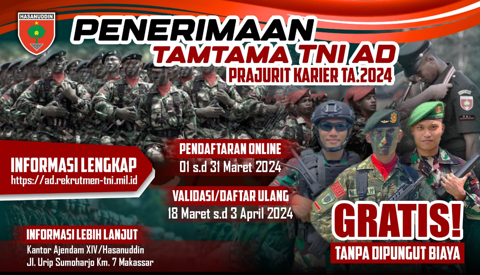 Kodam XIV/Hasanuddin Buka Pendaftaran Tamtama PK TNI AD Reguler dan Khusus TA 2024