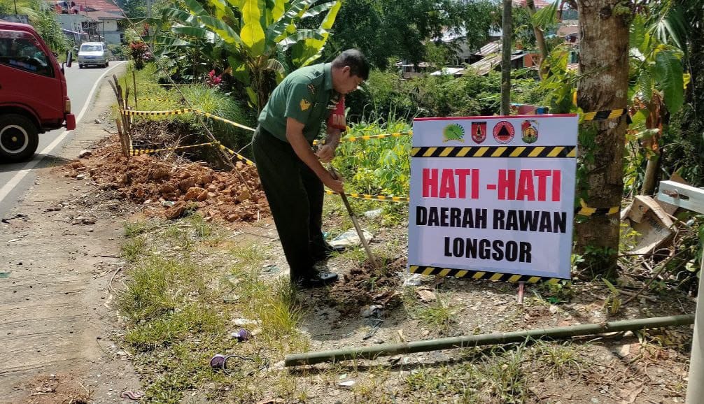 Rawan Longsor, Personel Koramil 1414-02/Rantepao Pasang Rambu di Sejumlah Titik Bahu Jalan