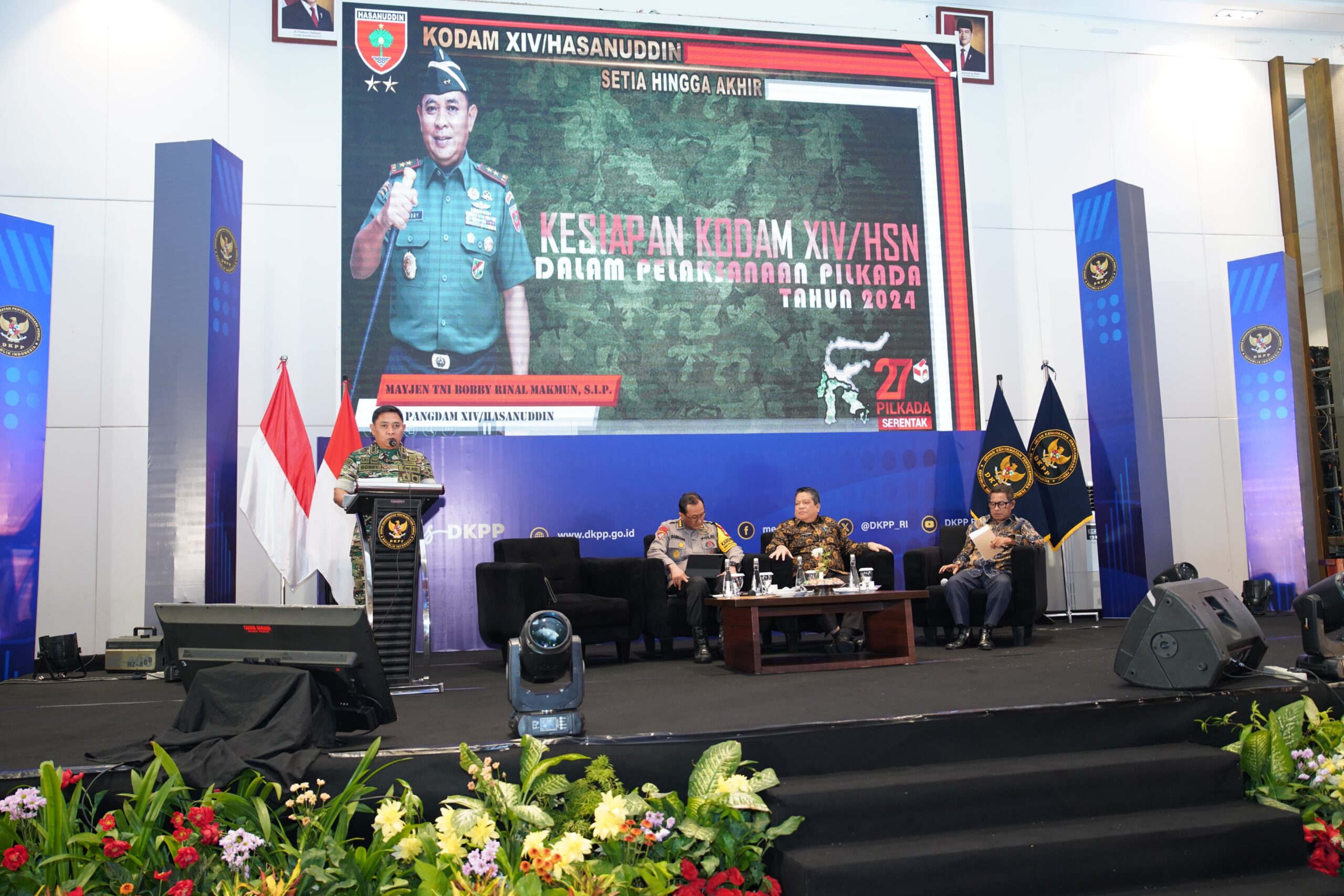Pelaksanaan Rakor tersebut dengan mengangkat tema “Wujudkan Pilkada 2024 Berintegritas dan Beretika”. Pada kesempatan ini Pangdam menyampaikan kesiapan Kodam XIV/Hasanuddin dalam penyelenggaraan Pilkada tahun 2024, bertempat di Hotel Claro jalan A.P. Peterani Kota Makassar. Jumat, (24/10/2024). (*).