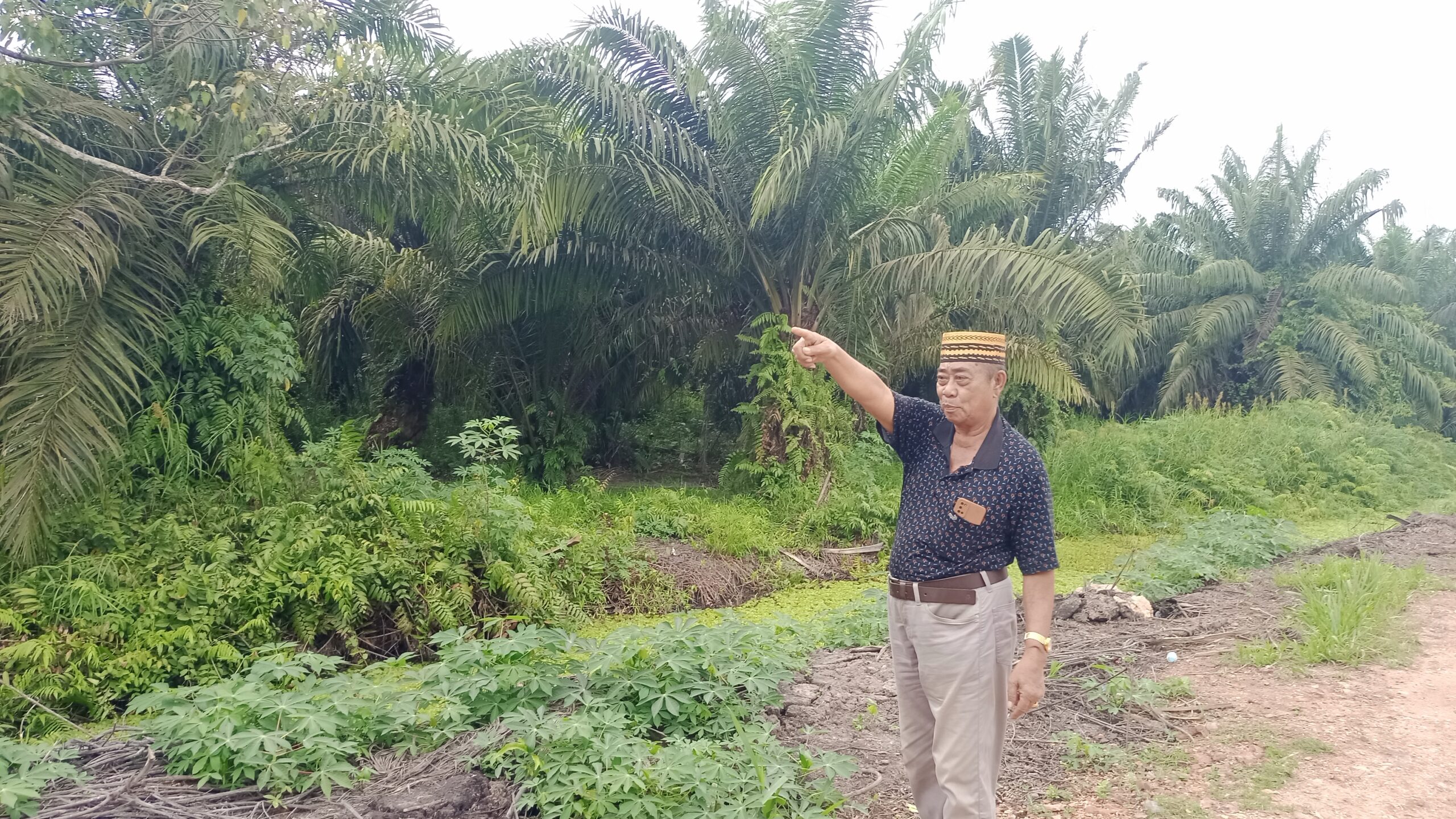 Saat, Laruse menunjukkan kebun kelapa sawit yang telah ditanami bibit kelapa sawit sejak tahun 2012 dan sudah sering dipanen hasilnya, namun sekarang menjadi objek sengketa (Poto : Nasution)
