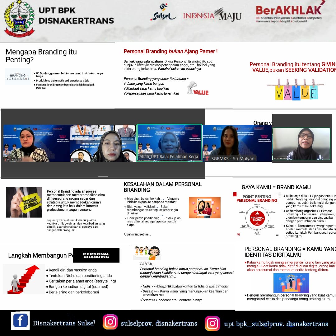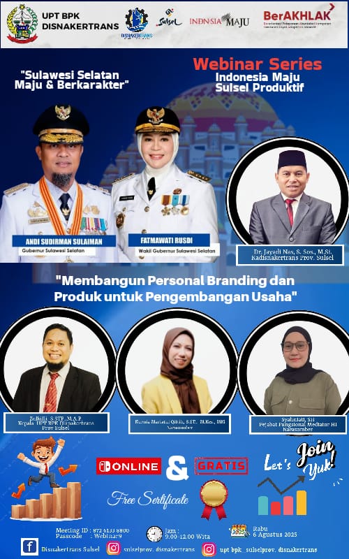 SIMAKBERITA.COM, MAKASSAR – UPT Balai Pelatihan Kerja Dinas Tenaga Kerja dan Transmigrasi Provinsi Sulawesi Selatan menyelenggarakan Webinar “Sulsel Produktif” bertema “Membangun Personal Branding dan Produk dalam Pengembangan Usaha”, sebagai bagian dari upaya Pemerintah Provinsi Sulawesi Selatan dalam mendorong terwujudnya daerah yang lebih produktif dan berdaya saing, Rabu (06//08/2025).