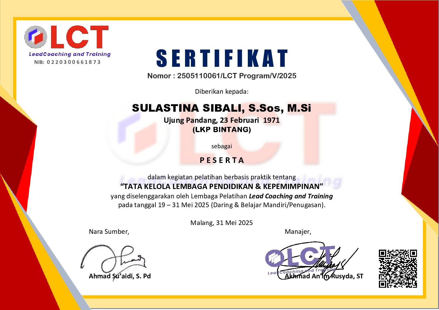SIMAKBERITA.COM, MAKASSAR – Dalam upaya meningkatkan kapasitas tata kelola dan kepemimpinan lembaga pendidikan, Sulastina Sibali, S.Sos., M.Si, perwakilan dari LKP Bintang, telah berhasil menyelesaikan Pelatihan Berbasis...